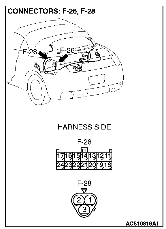 STEP 3. Check convertible top control module connector F-26 and Tonneau latch switch (LH) connector F-28 for loose, corroded or damaged terminals, or terminals pushed back in the connector.
