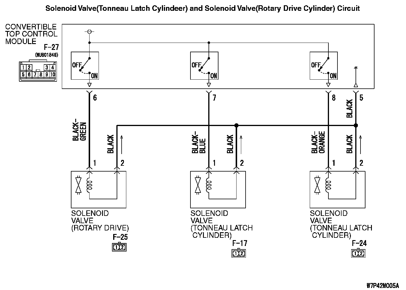 YES : Check the harness between convertible top control module connector F-27 (terminal 7, 5) and solenoid valve (tonneau latch cylinder) connector F-17 (terminal 1, 2). Repair as necessary.