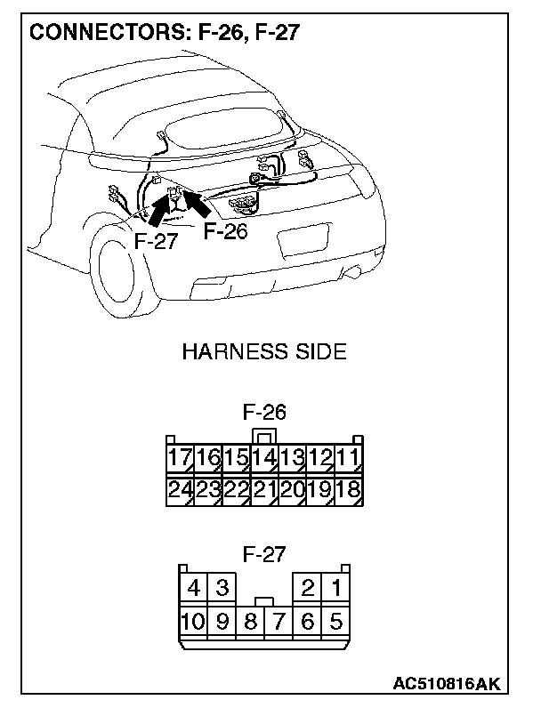 STEP 7. Check convertible top control module connector F-26 and F-27 for loose, corroded or damaged terminals, or terminals pushed back in the connector.