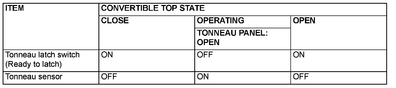 The convertible top control module judges the tonneau panel state based on the signals from the tonneau sensor provided on the tonneau drive cylinder and right and left tonneau latch switches (Ready to latch). The tonneau sensor and tonneau latch switches (Ready to latch) set the following signals to the convertible top control module according to the tonneau panel state.