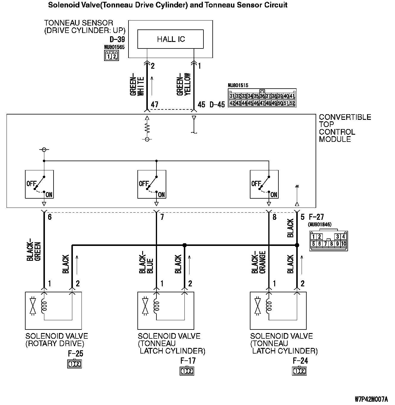 YES : Check the harness between convertible top control module connector F-27 (terminal 9, 5) and solenoid valve (tonneau drive cylinder) connector F-16 (terminal 1, 2). Repair as necessary.