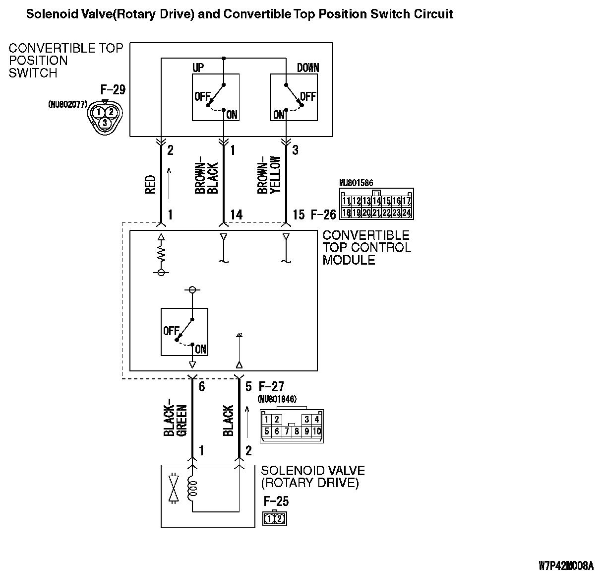 YES : Check the harness between convertible top control module connector F-27 (terminal 7, 5) and solenoid valve (rotary drive cylinder) connector F-16 (terminal 1, 2). Repair as necessary.