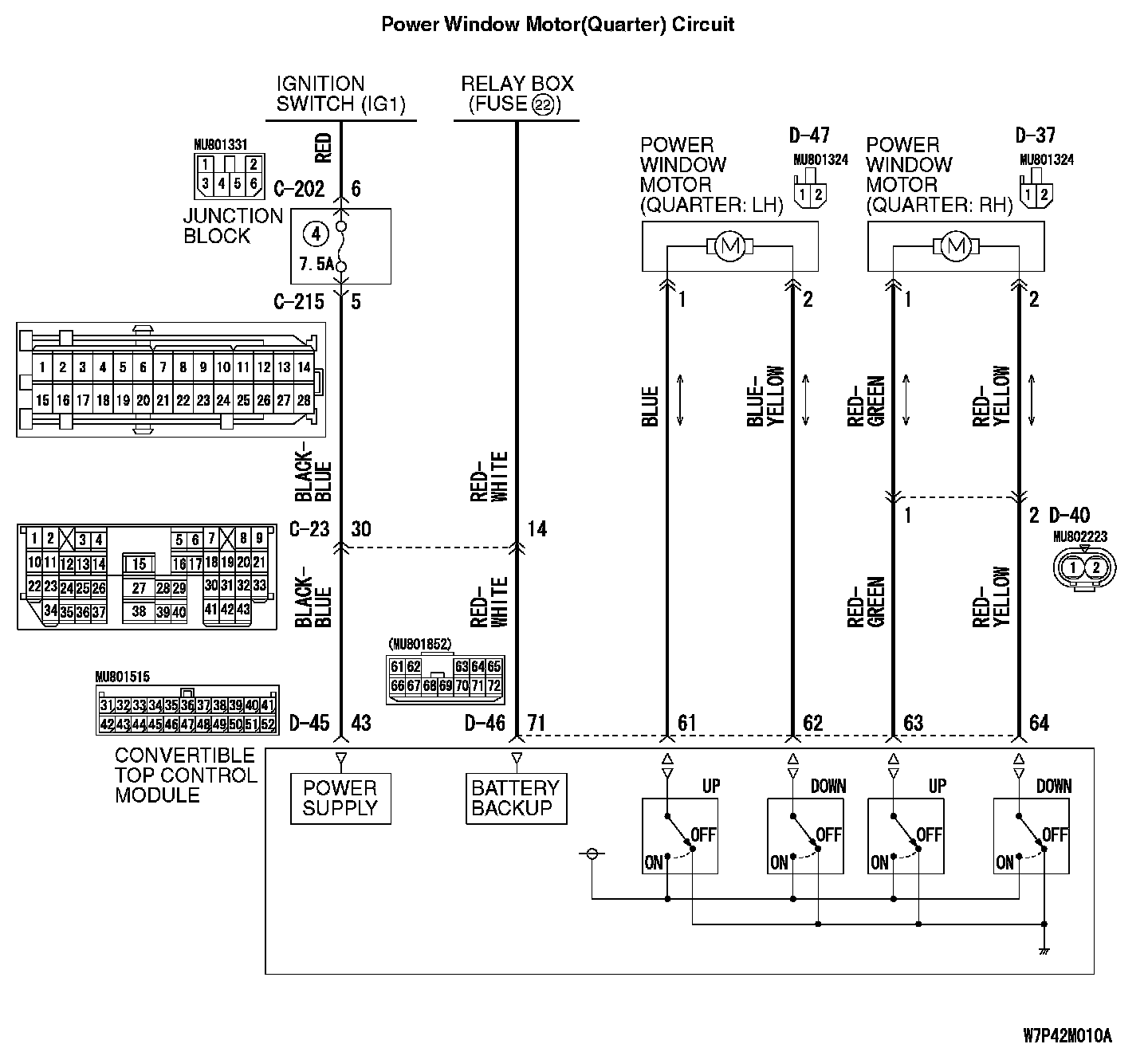 At convertible top operation, the convertible top control module applies current to the power window motor (quarter) to lower the quarter window glass. When it detects the motor lock current from the power window motor (quarter), it determines that the quarter window glass is lowered to the end, and then stops this control.