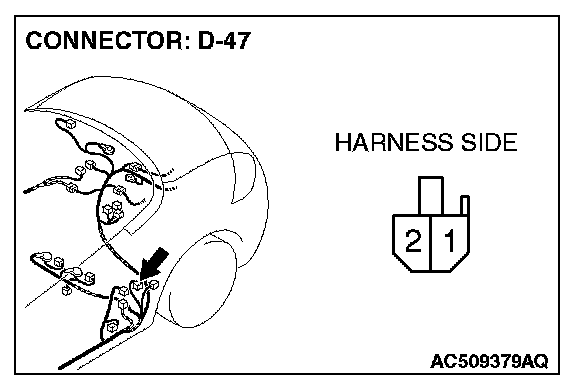 STEP 2. Check power window motor (quarter: LH) connector D-47 for loose, corroded or damaged terminals, or terminals pushed back in the connector.
