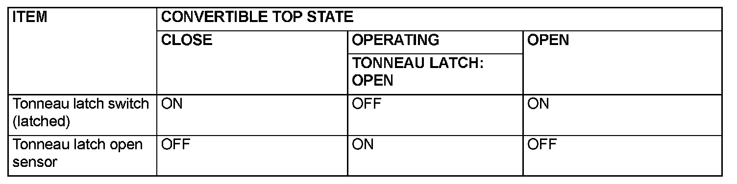 The convertible top control module judges the tonneau latch state based on the signals from the right and left tonneau latch switches (Latched) and the tonneau latch open sensor provided on the tonneau latch cylinder. The tonneau latch open sensor and tonneau latch switch (Latched) output the following signals to the convertible top control module according to the tonneau latch state.