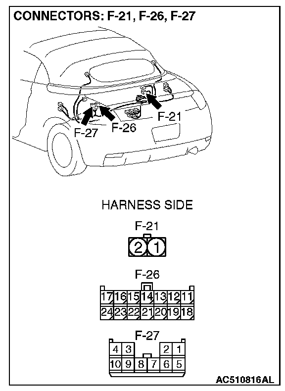 STEP 3. Check convertible top control module connector F-26, F-27 and tonneau latch open sensor connector F-21 for loose, corroded or damaged terminals, or terminals pushed back in the connector.
