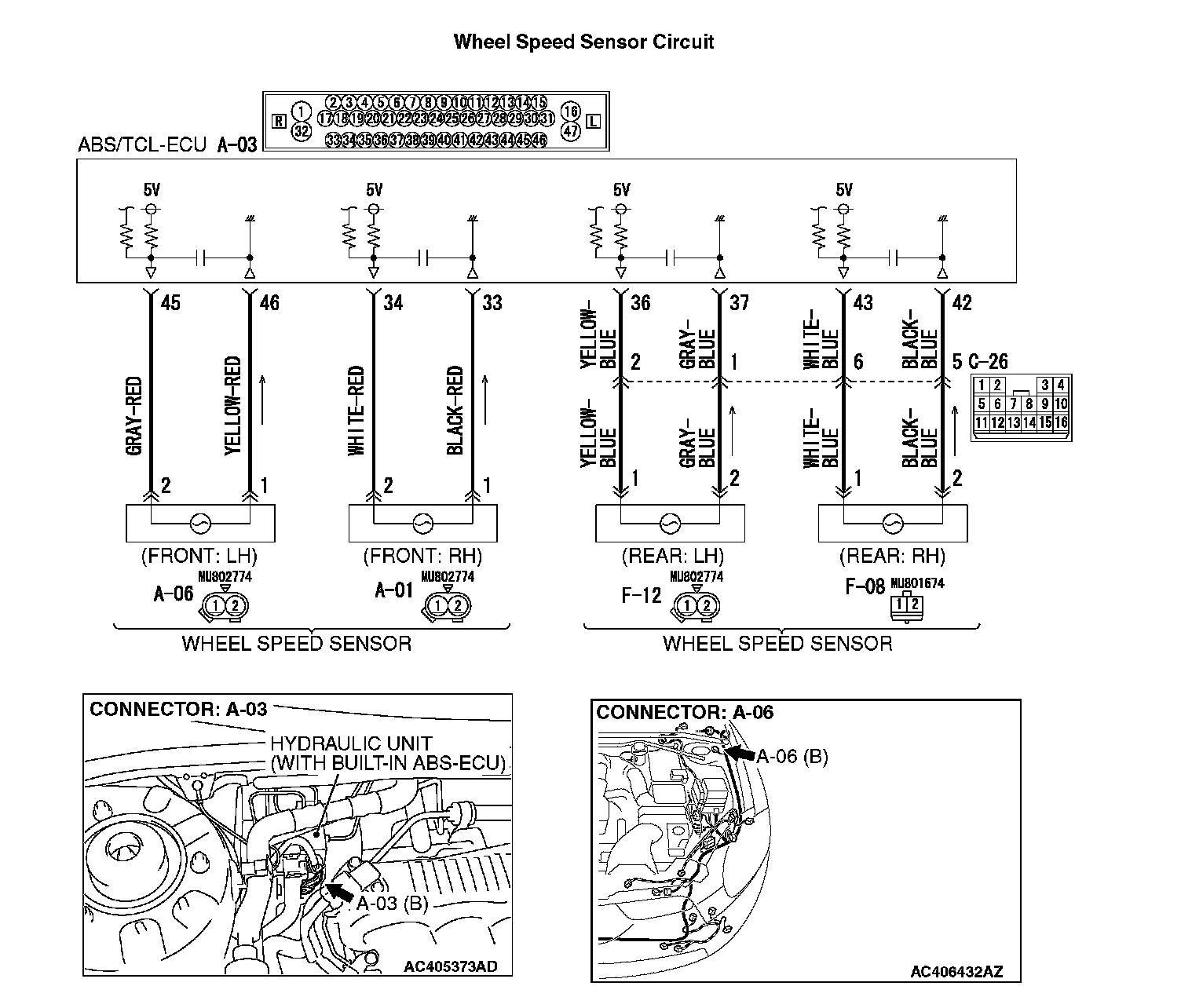 STEP 8. Check the harness wires between ABS/TCL-ECU connector A-03 (terminal 45, 46) and wheel speed sensor connector A-06 (terminal 2, 1).