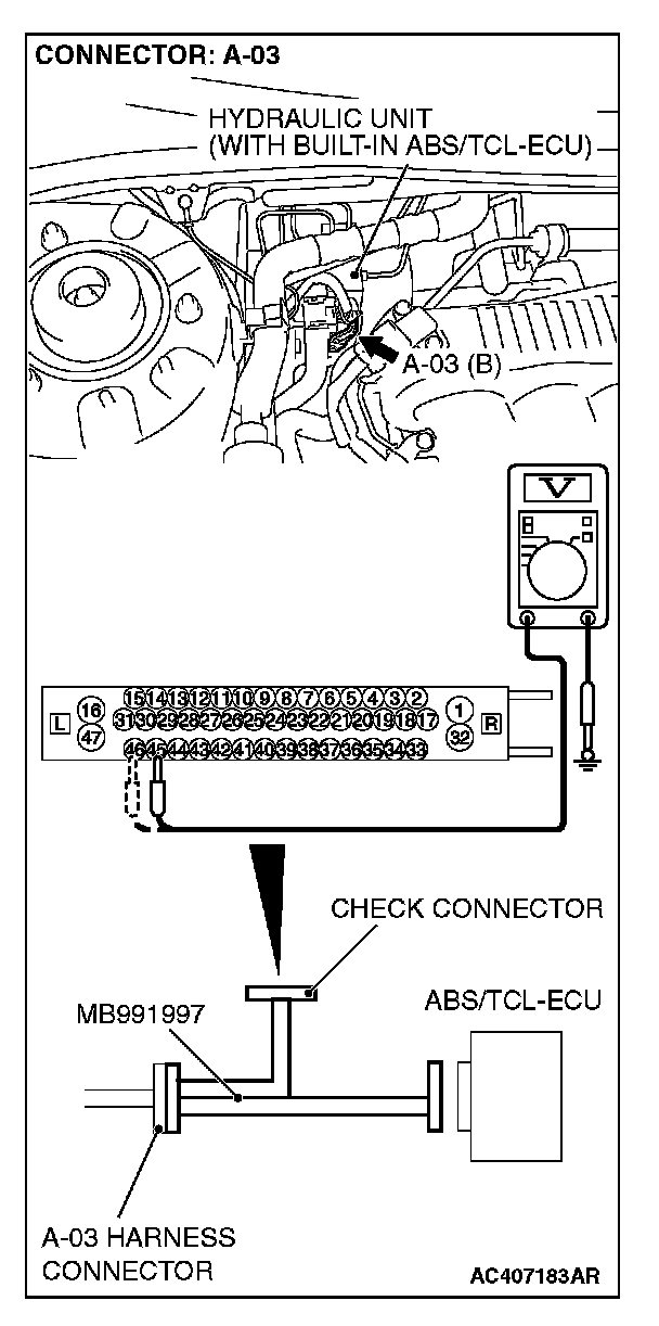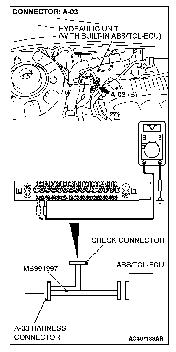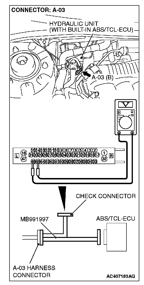 (1) Disconnect the connector A-03, and connect special tool MB991997 to the wiring harness-side connector.