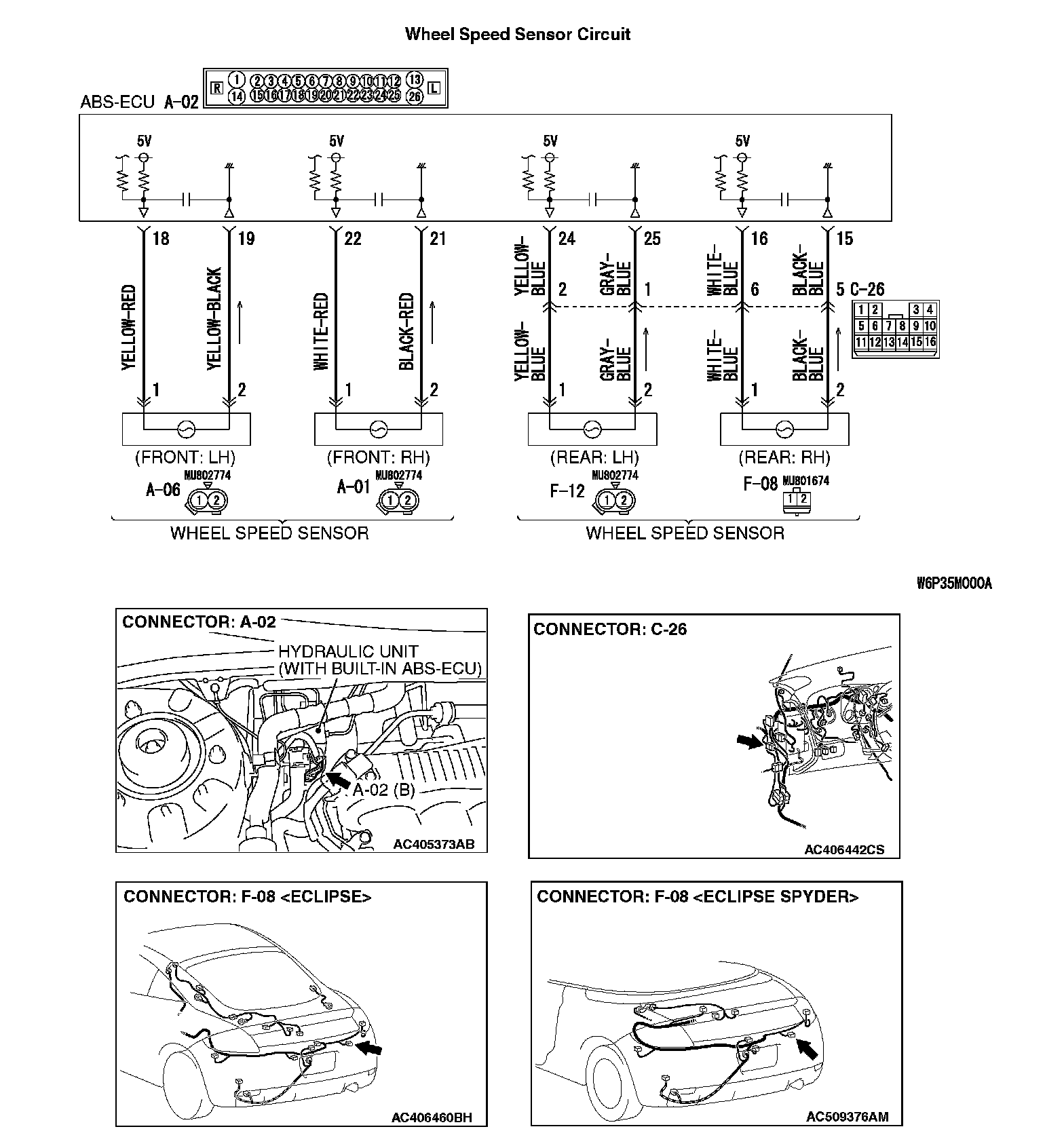 Q: Are ABS-ECU connector A-02, intermediate connector C-26 and wheel speed sensor [rear: RH] connector F-08 damaged?