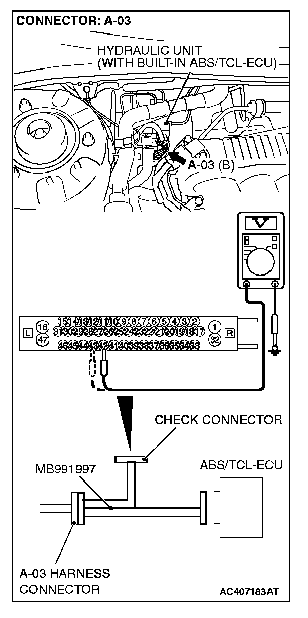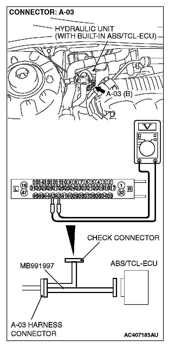 (1) Disconnect the connector A-03, and connect special tool MB991997 to the wiring harness-side connector.