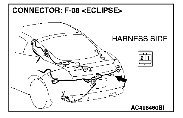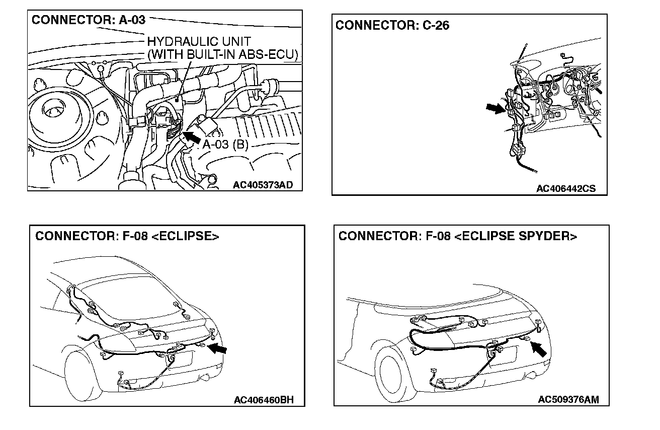 STEP 11. Check ABS/TCL-ECU connector A-03, intermediate connector C-26 and wheel speed sensor [Rear: RH] connector F-08 for loose, corroded or damaged terminals, or terminals pushed back in the connector.