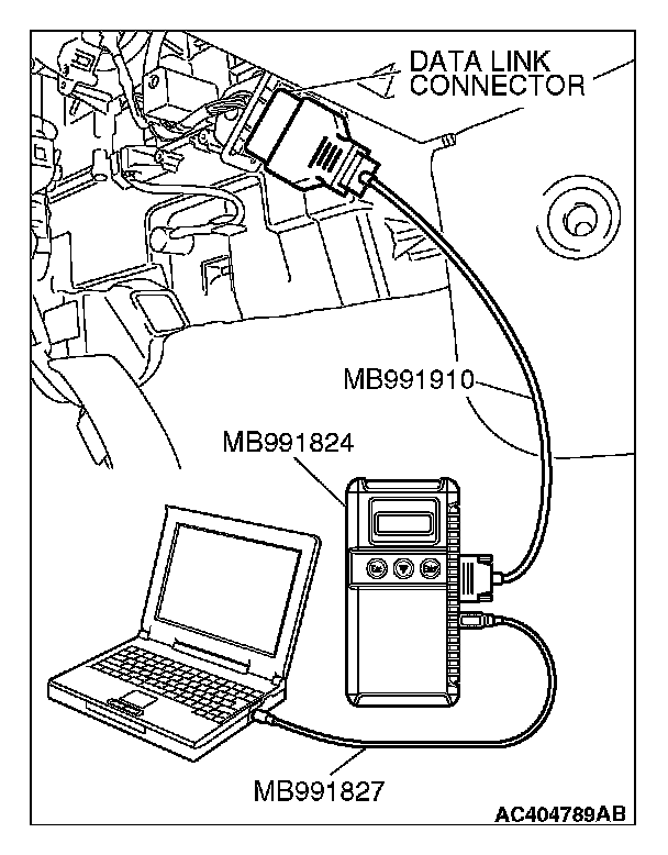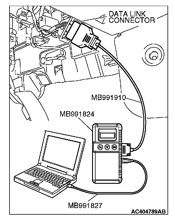 CAUTION: To prevent damage to scan tool MB991958, always turn the ignition switch to the "LOCK" (OFF) position before connecting or disconnecting scan tool MB991958.