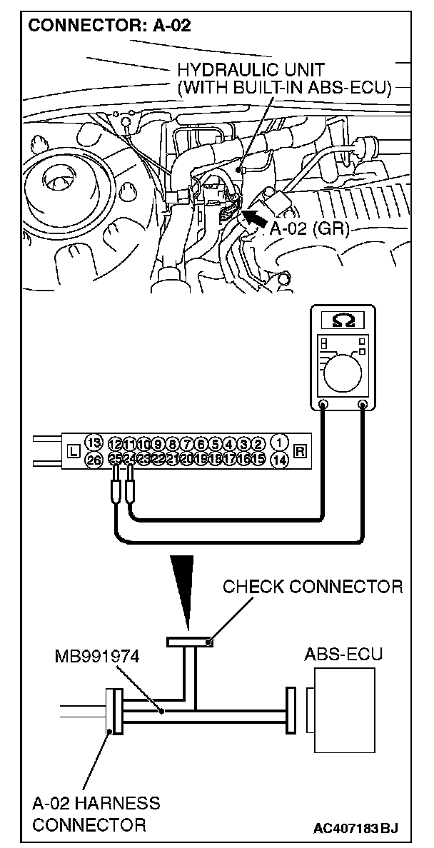 (1) Disconnect the connector A-02, and connect special tool MB991974 to the wiring harness-side connector.