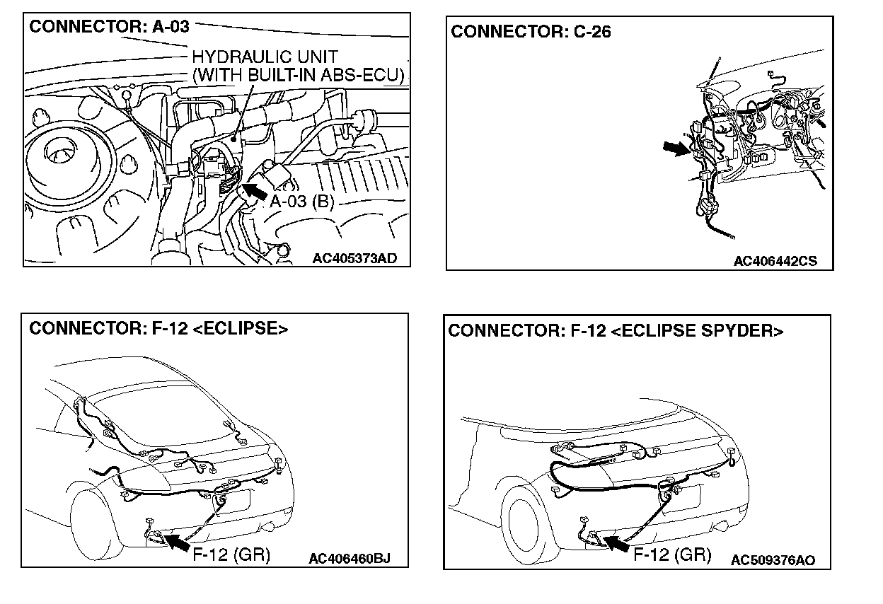 STEP 7. Check ABS/TCL-ECU connector A-03, intermediate connector C-26 and wheel speed sensor [rear: LH] connector F-12 for loose, corroded or damaged terminals, or terminals pushed back in the connector.