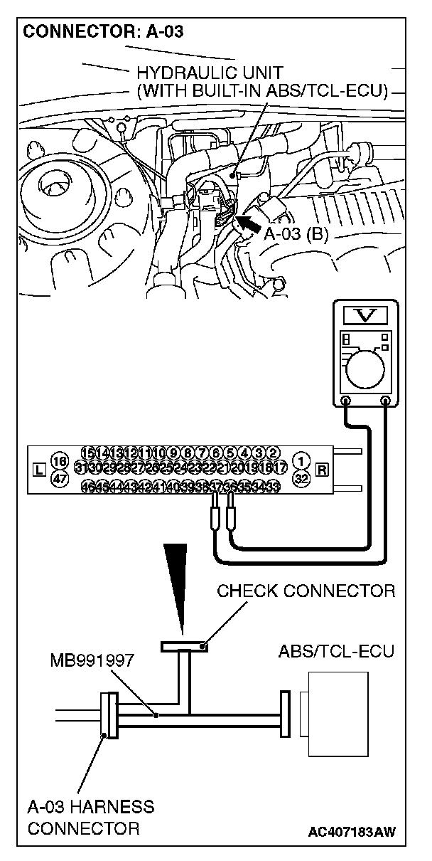(1) Disconnect the connector A-03, and connect special tool MB991997 to the wiring harness-side connector.