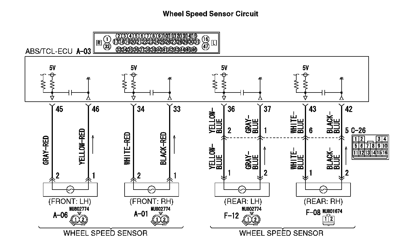 Q: Are ABS/TCL-ECU connector A-03, intermediate connector C-26 and wheel speed sensor [Rear: LH] connector F-12 damaged?