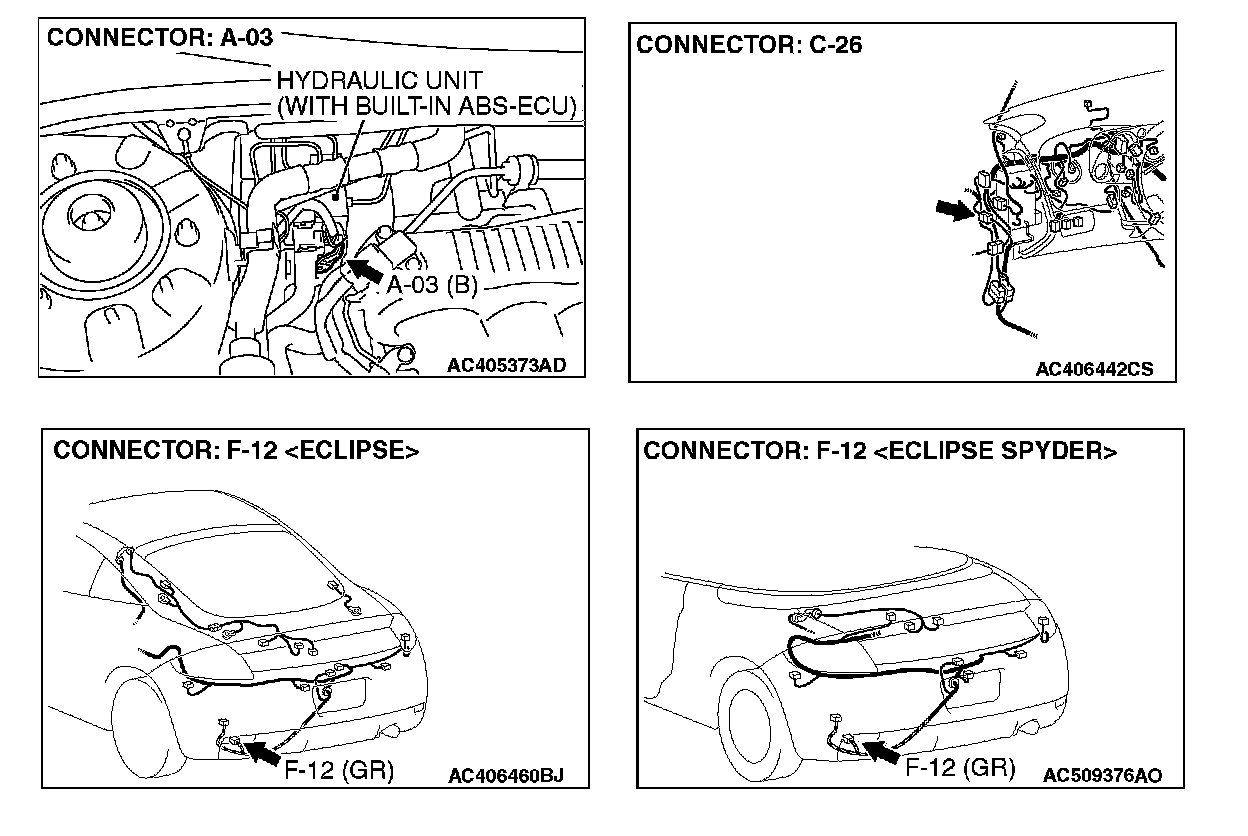 STEP 11. Check ABS/TCL-ECU connector A-03, intermediate connector C-26 and wheel speed sensor [Rear: LH] connector F-12 for loose, corroded or damaged terminals, or terminals pushed back in the connector.