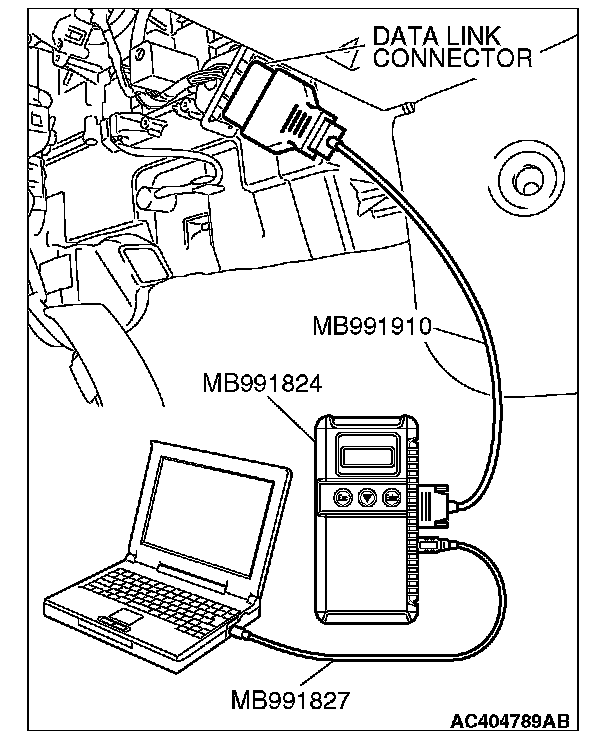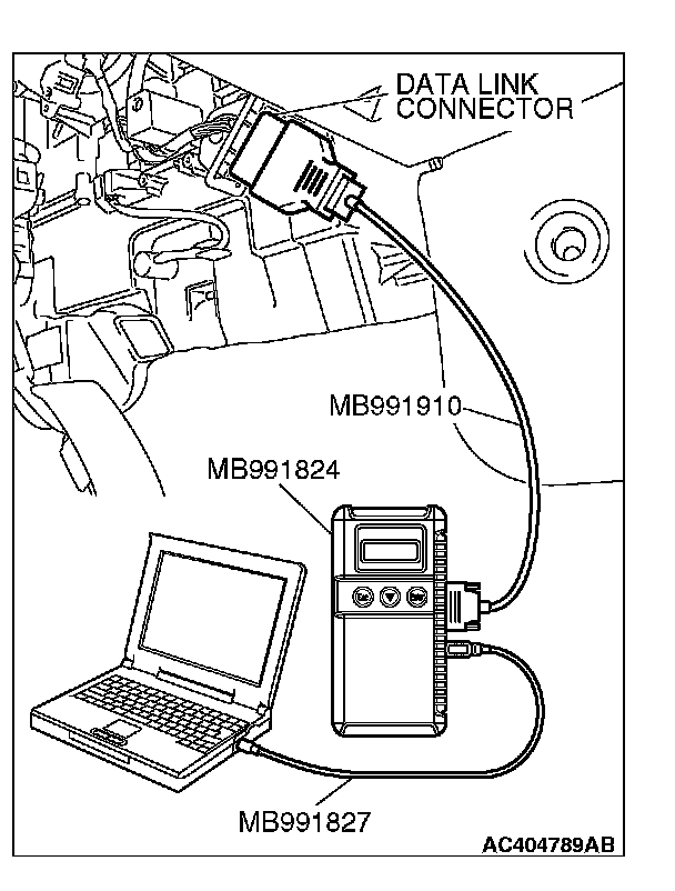 CAUTION: To prevent damage to scan tool MB991958, always turn the ignition switch to the "LOCK" (OFF) position before connecting or disconnecting scan tool MB991958.