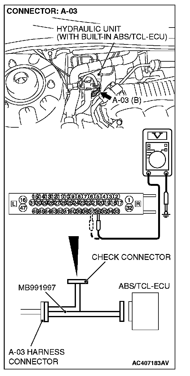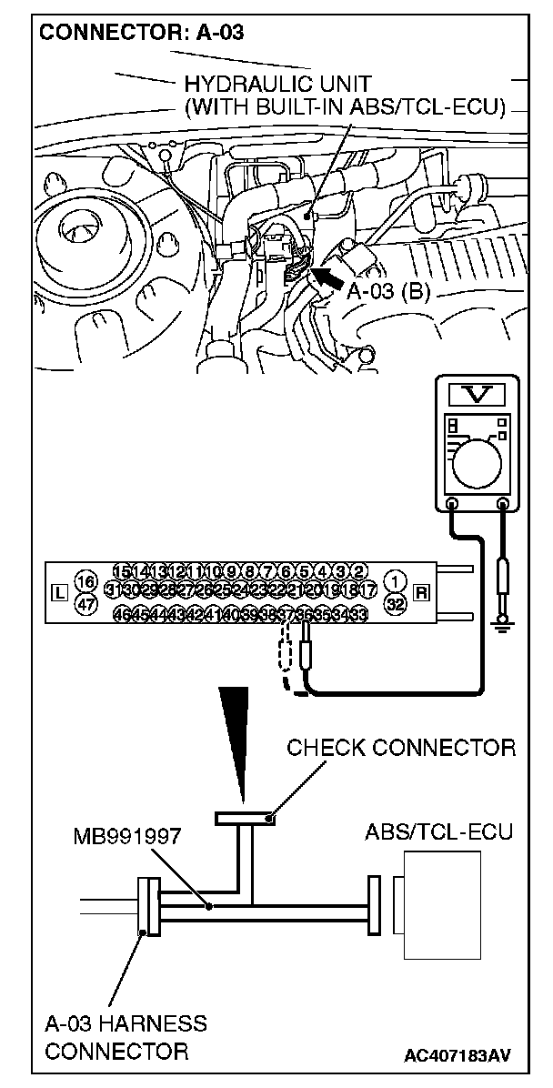 (1) Disconnect the connector A-03, and connect special tool MB991997 to the wiring harness-side connector.
