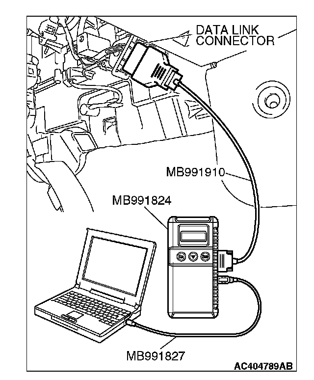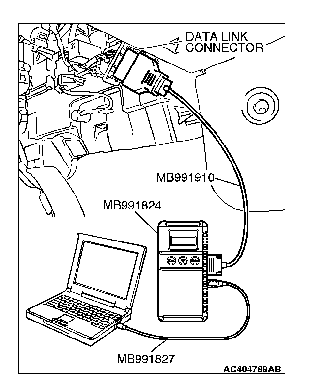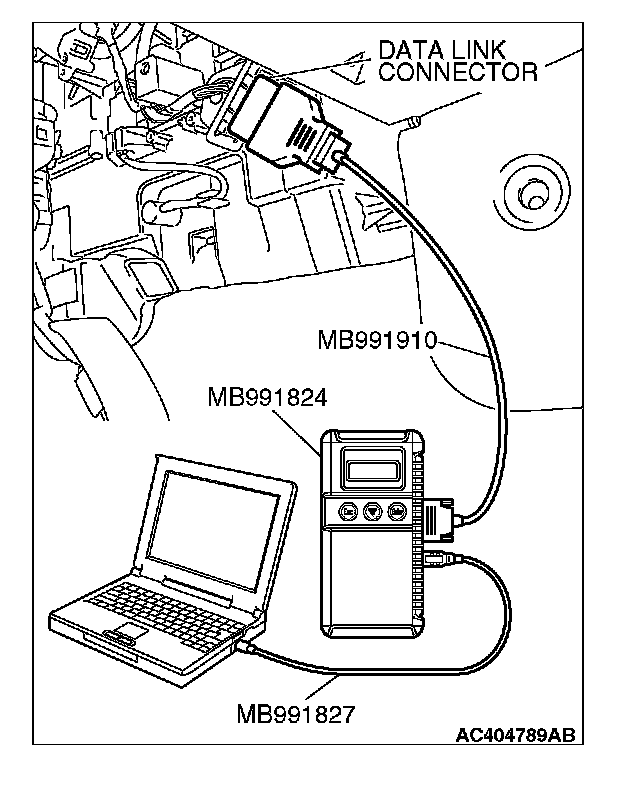 CAUTION: To prevent damage to scan tool MB991958, always turn the ignition switch to the "LOCK" (OFF) position before connecting or disconnecting scan tool MB991958.