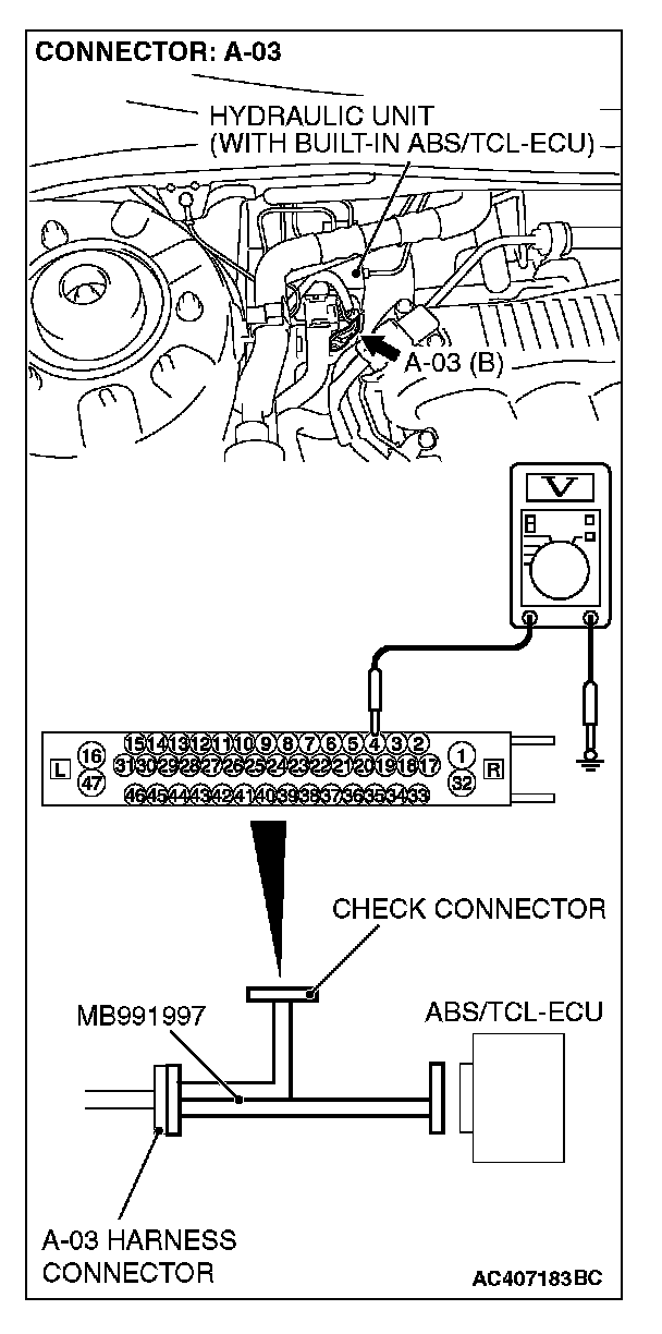 (1) Disconnect the connector A-03, and connect special tool MB991997 to the wiring harness-side connector.