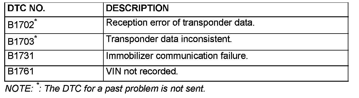 DIAGNOSTIC TROUBLE CODE CHARTCAUTION: During diagnosis, a DTC associated with other system may be set when the ignition switch is turned "ON" position with connector(s) disconnected. On completion, confirm all systems for DTC(s). If DTC(s) are sets, erase them all.
