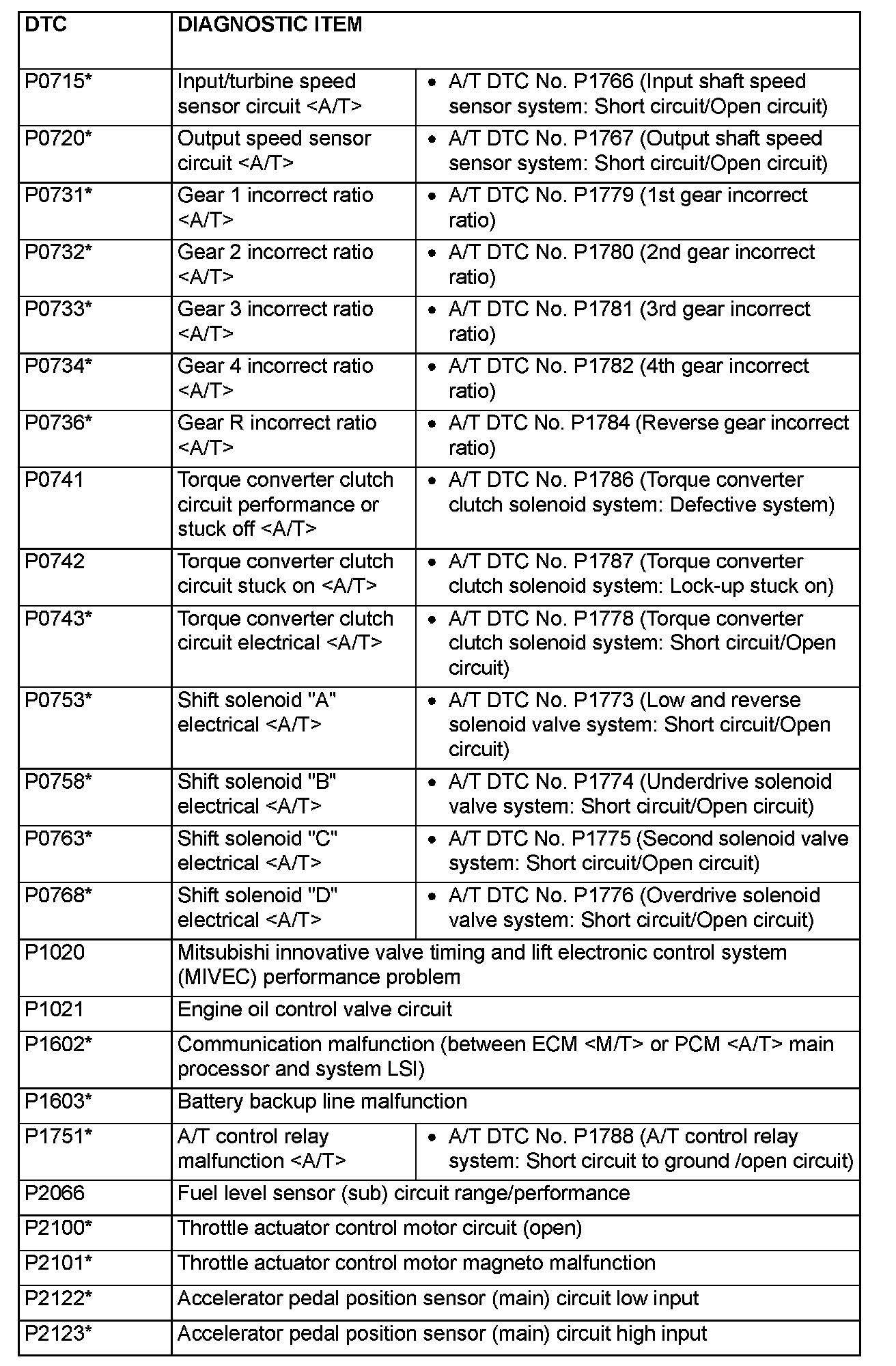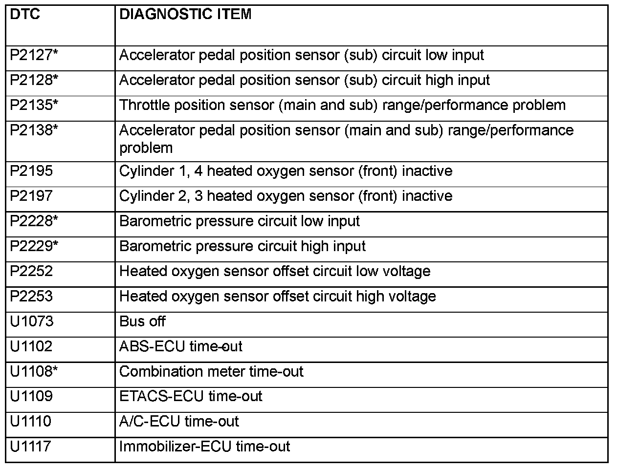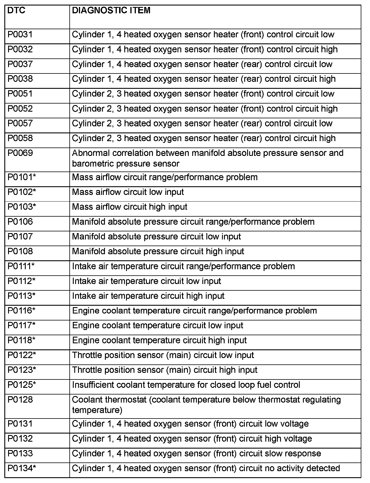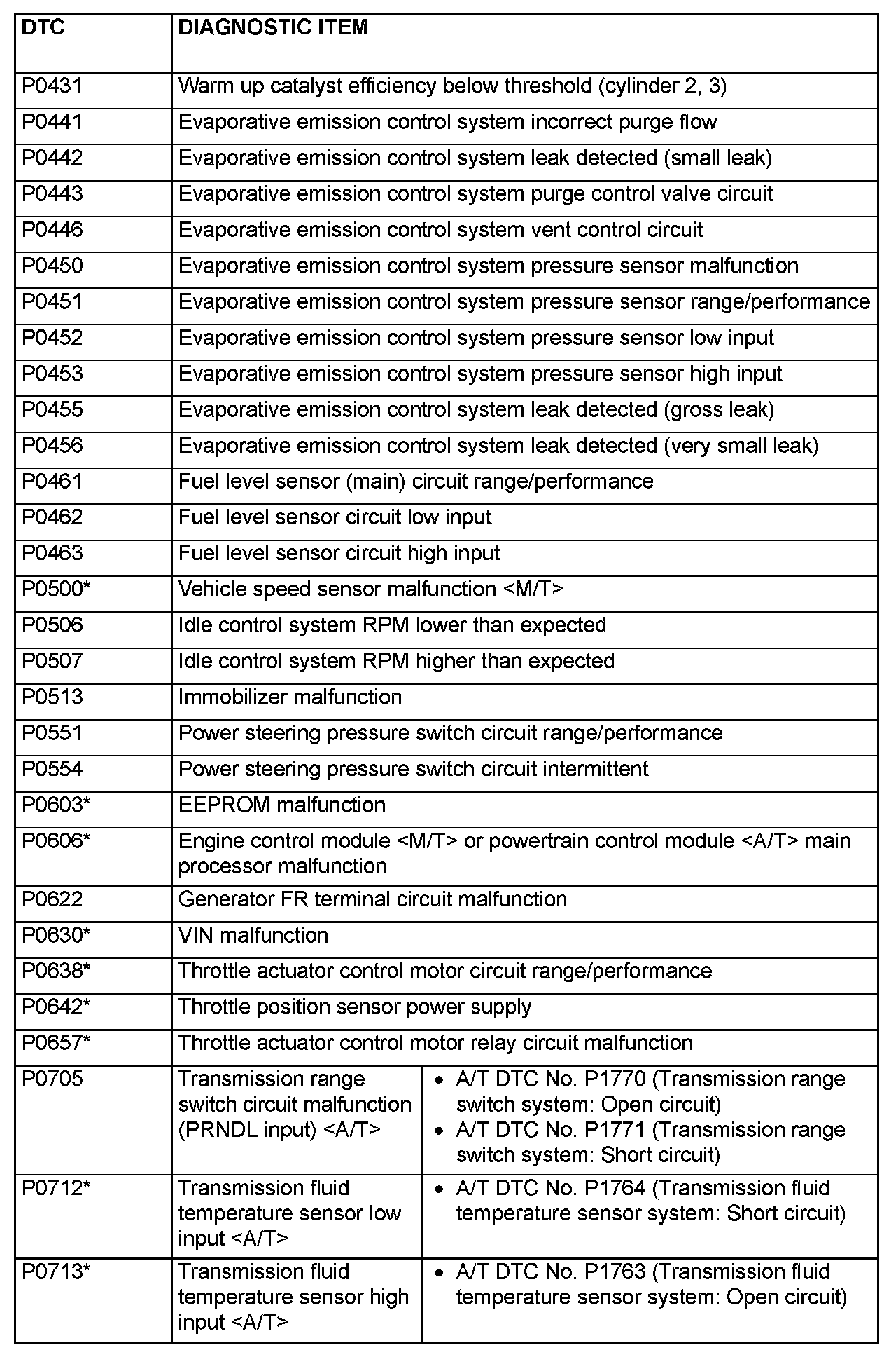 - After the ECM [M/T] or the PCM [A/T] detects a malfunction, a diagnostic trouble code is recorded the next time the engine is started and the same malfunction is re-detected. However, for items marked with a "*", the diagnostic trouble code is recorded on the first detection of the malfunction.