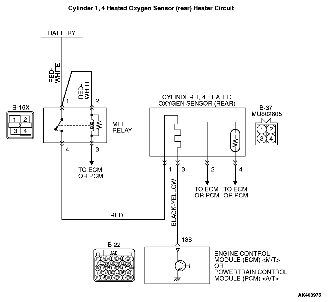 - Power is supplied from the MFI relay (terminal No. 4) to the cylinder 1, 4 heated oxygen sensor (rear) heater.