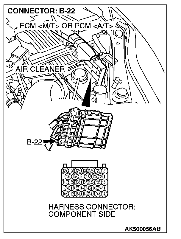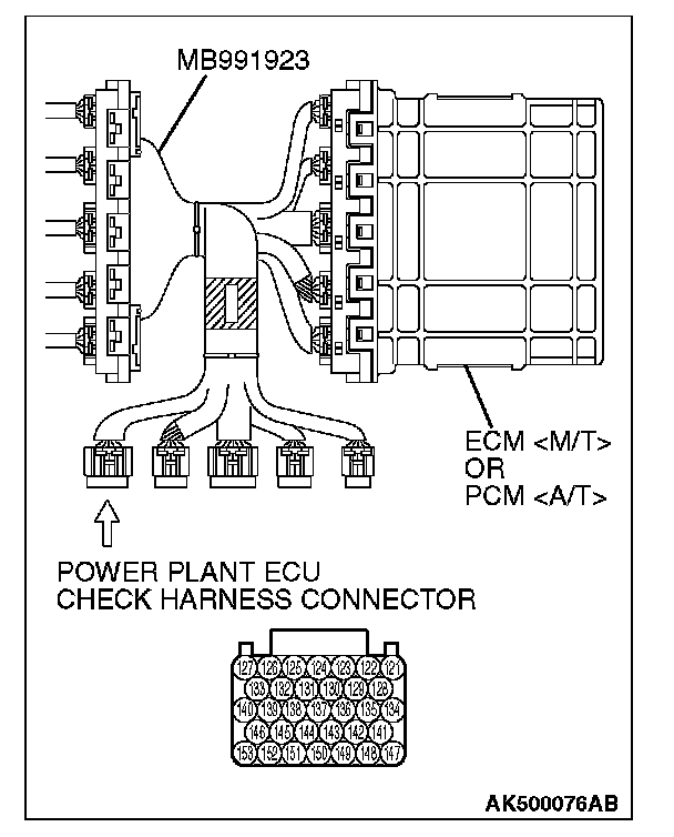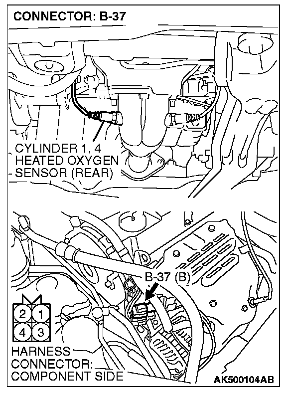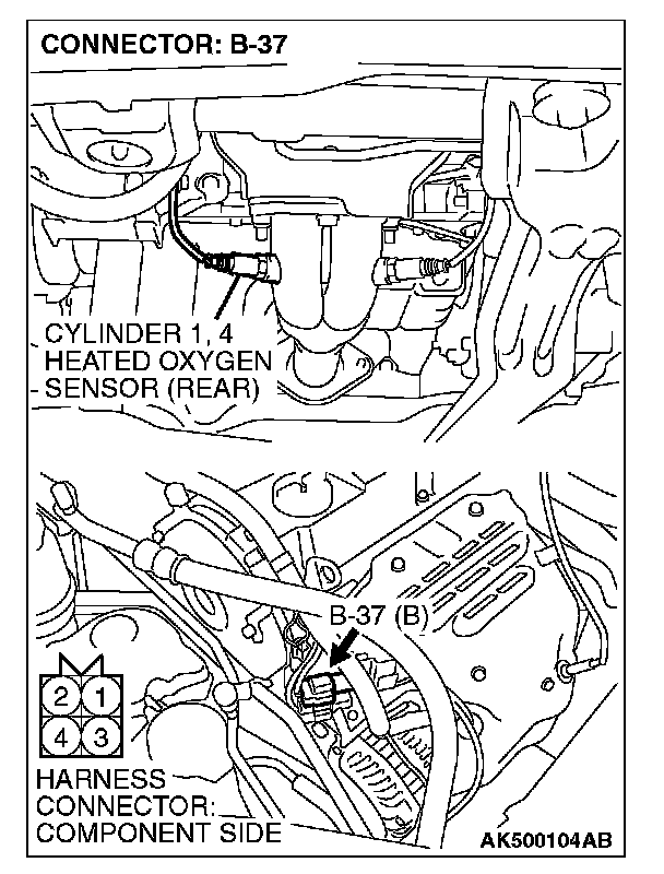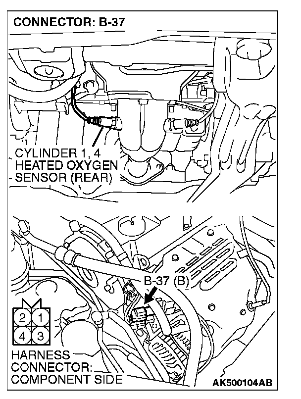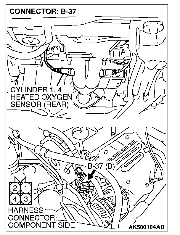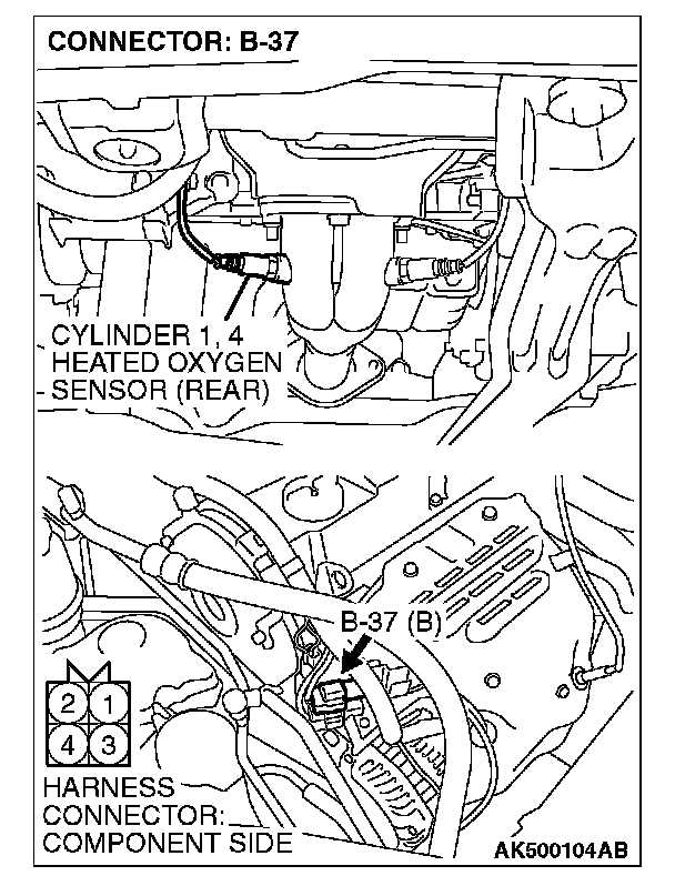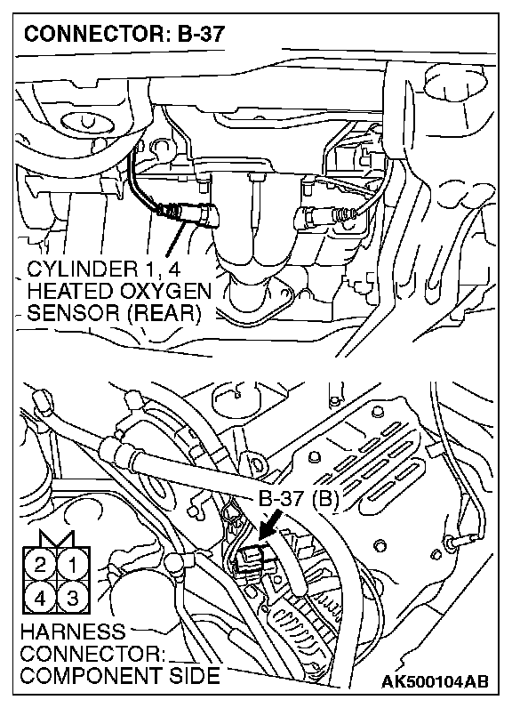 1. Disconnect cylinder 1, 4 heated oxygen sensor (rear) connector B-37 and connect test harness special tool, MD998464, to the connector on the cylinder 1, 4 heated oxygen (rear) sensor side.