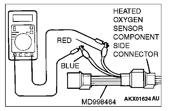 2. Measure the resistance between heated oxygen sensor connector terminal No. 1 (red clip) and terminal No. 3 (blue clip).