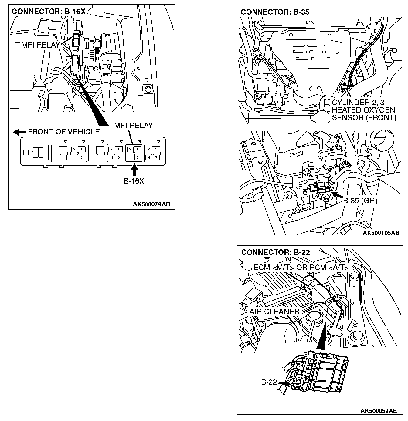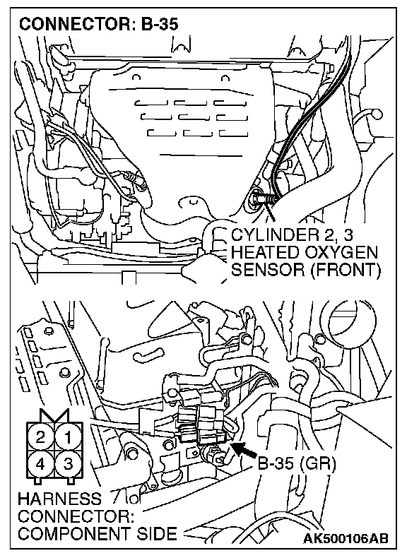 1. Disconnect cylinder 2, 3 heated oxygen sensor (front) connector B-35 and connect test harness special tool, MB991316, to the connector on the cylinder 2, 3 heated oxygen (front) sensor side.