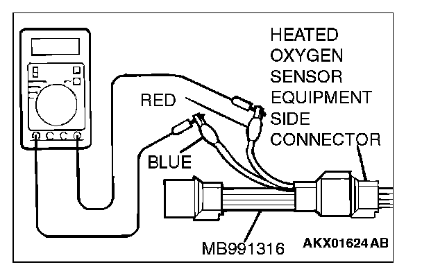 2. Measure the resistance between heated oxygen sensor connector terminal No. 1 (red clip) and terminal No. 3 (blue clip).