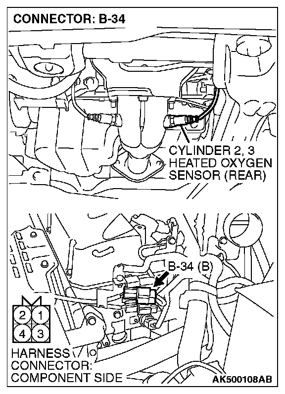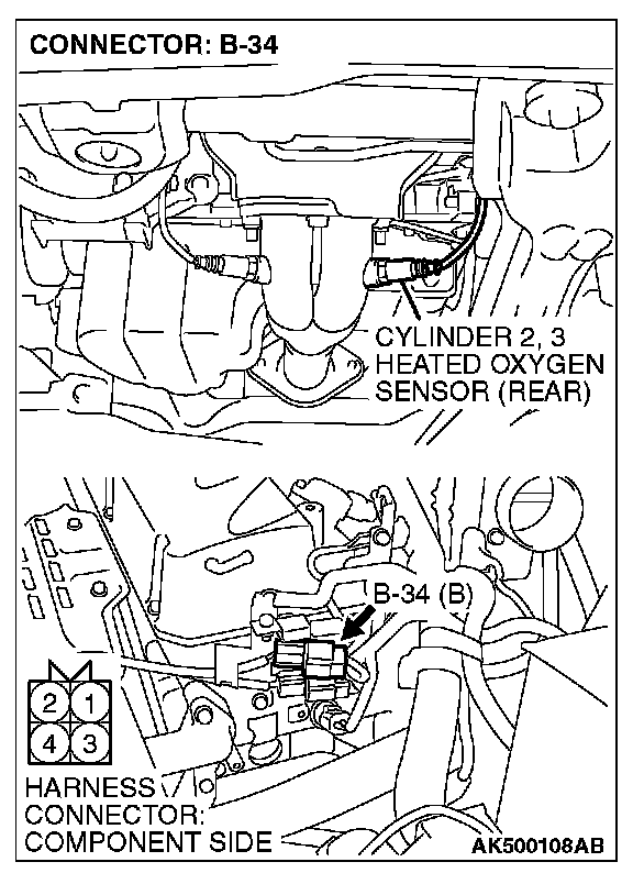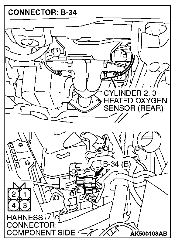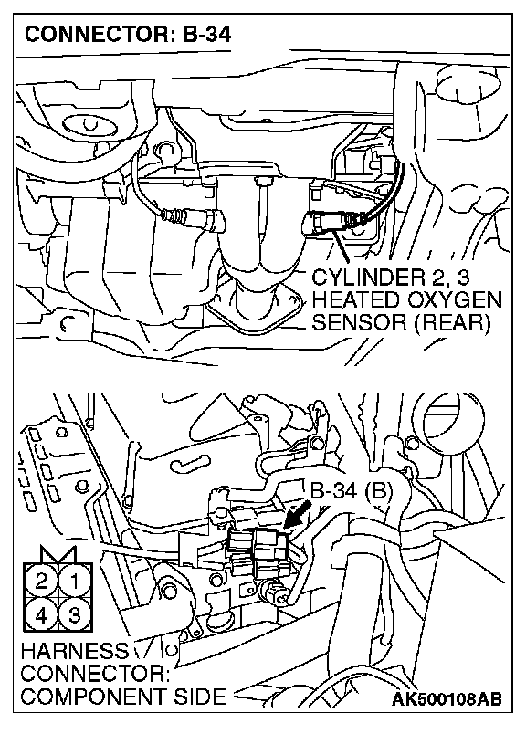1. Disconnect cylinder 2, 3 heated oxygen sensor (rear) connector B-34 and connect test harness special tool, MD998464, to the connector on the cylinder 2, 3 heated oxygen (rear) sensor side.