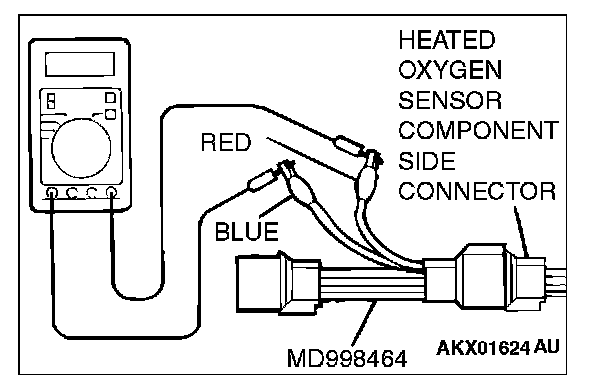 2. Measure the resistance between heated oxygen sensor connector terminal No. 1 (red clip) and terminal No. 3 (blue clip).