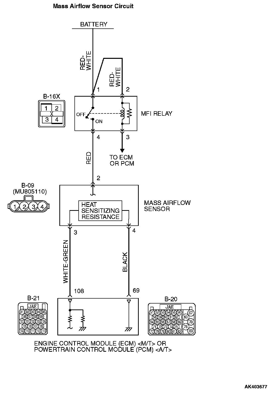 - The mass airflow sensor power is supplied from the MFI relay (terminal No. 4), and the ground is provided on the ECM