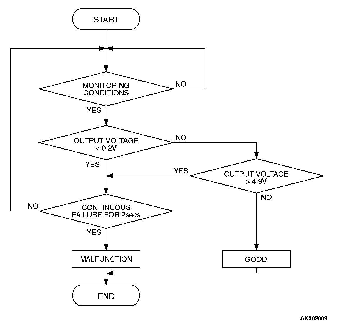 - Mass airflow sensor output voltage has continued to be lower than 0.2 volt for 2 seconds.