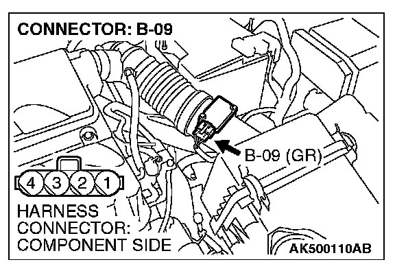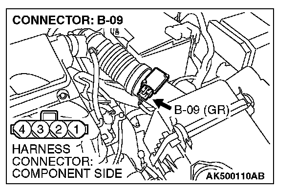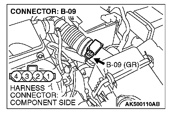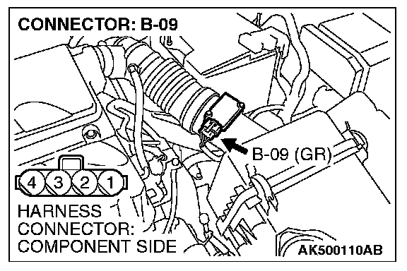 STEP 2. Check harness connector B-09 at mass airflow sensor for damage.
