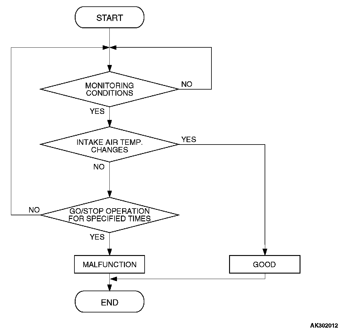 Intake air temperature sensor output voltage does not change when specified go/stop operations are repeated.