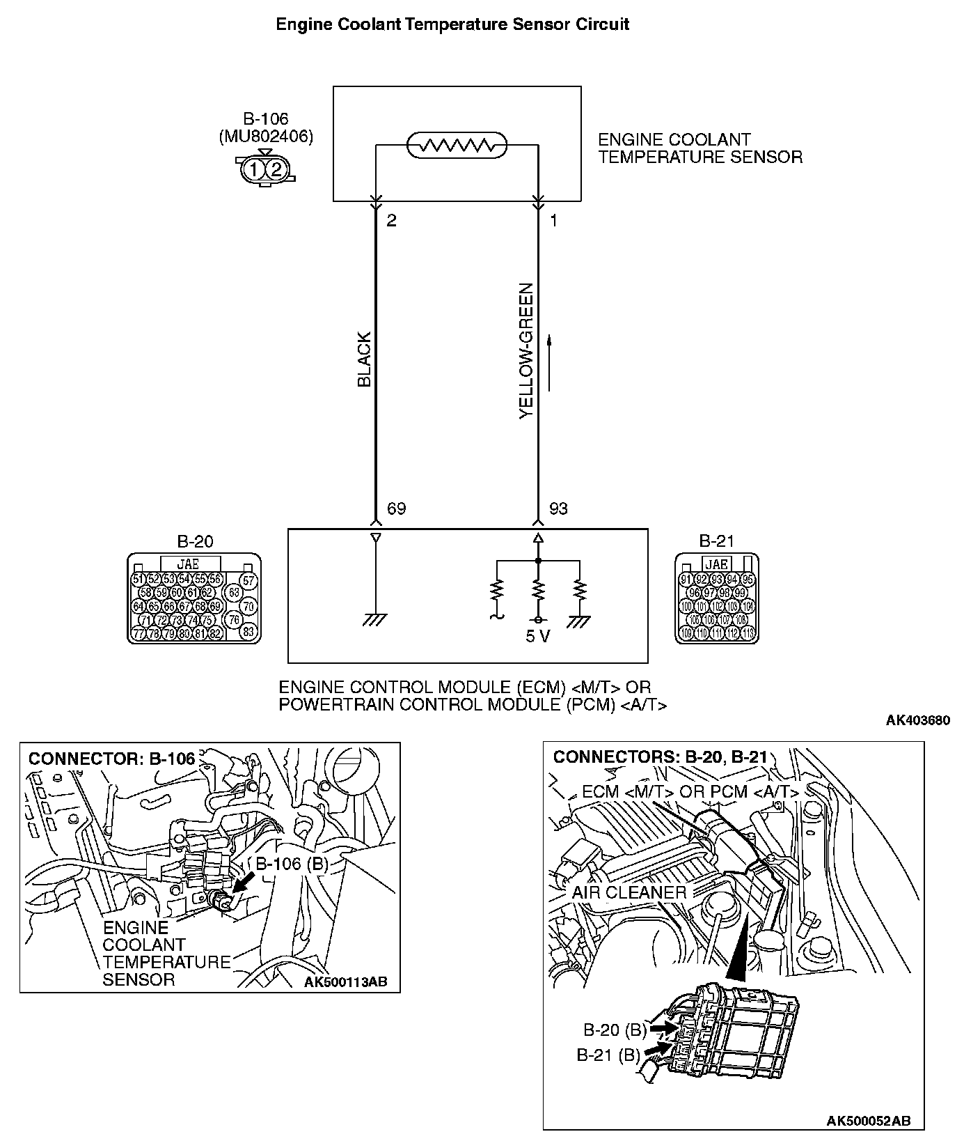 - 5-volt voltage is applied to the engine coolant temperature sensor output terminal (terminal No. 1) from the ECM