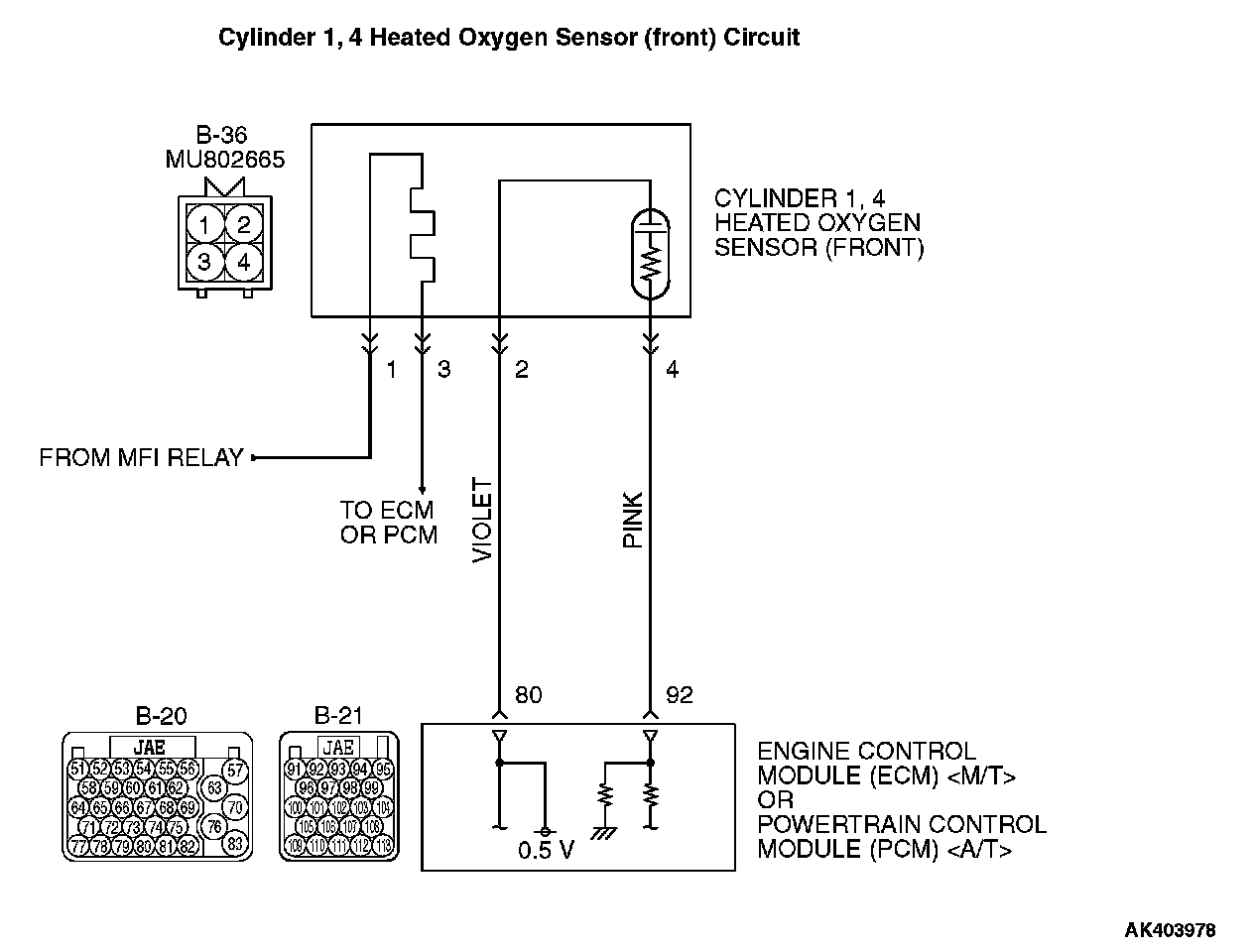 - Terminal No. 2 of the cylinder 1, 4 heated oxygen sensor (front) is grounded with ECM