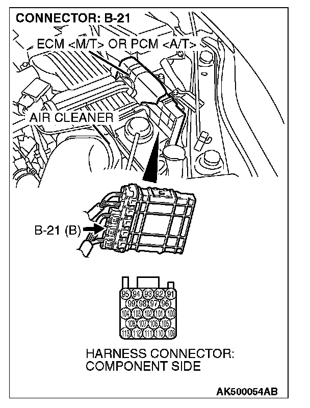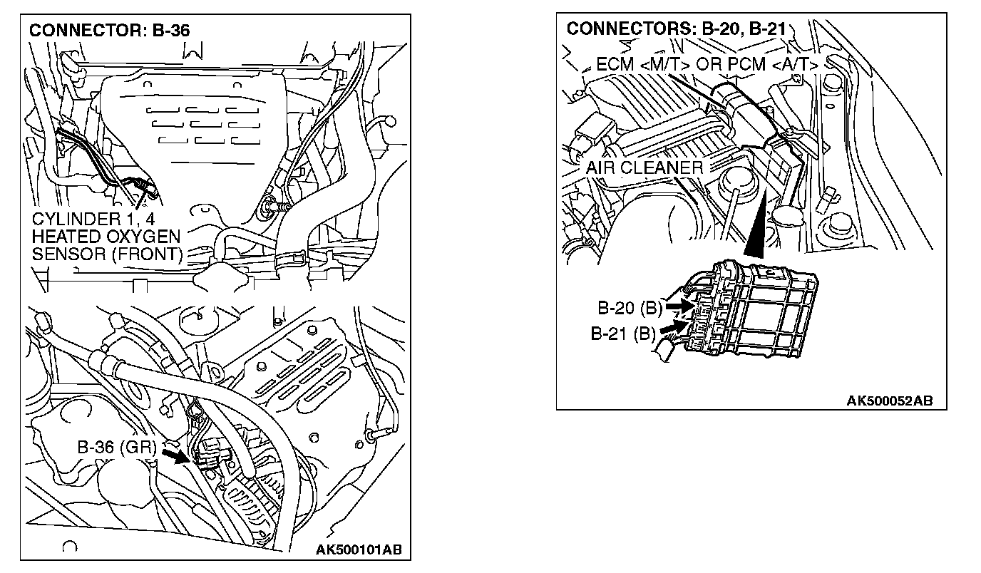 STEP 1. Check harness connector B-36 at cylinder 1, 4 heated oxygen sensor (front) and harness connector B-21 at ECM