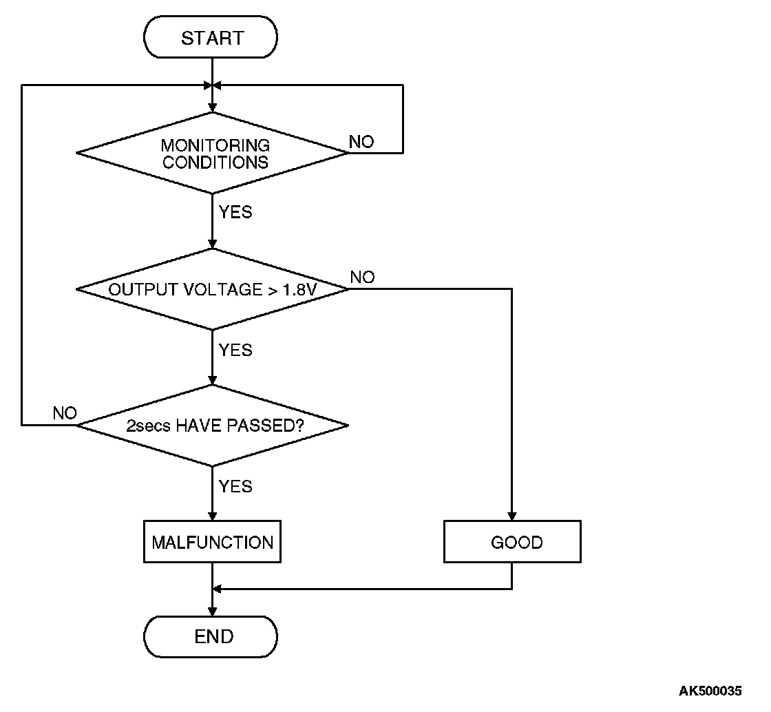 - Cylinder 1, 4 heated oxygen sensor (front) output voltage has continued to be 1.8 volts or higher for 2 seconds.
