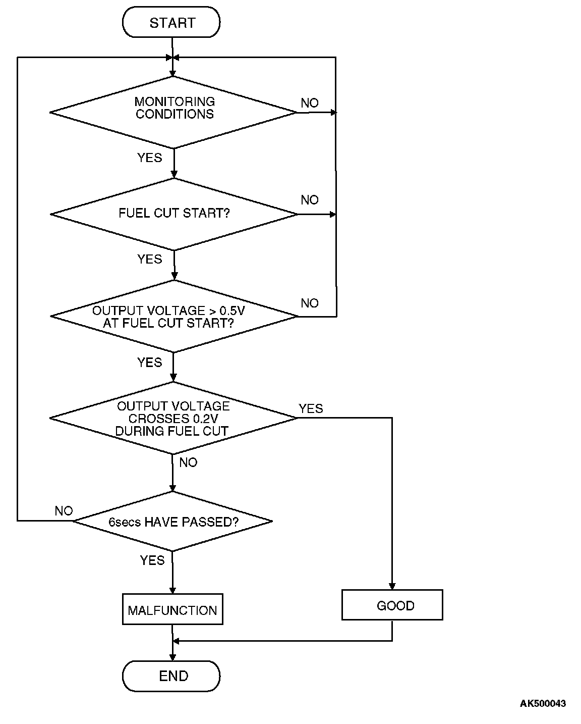 - Cylinder 1, 4 heated oxygen sensor (rear) output voltage does not reach 0.2 volt for 6 seconds from fuel cut start.