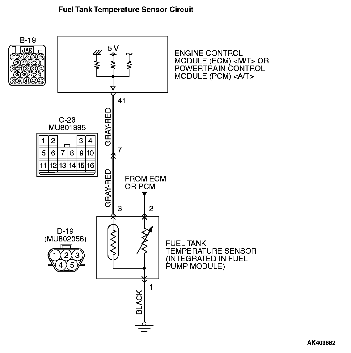 - 5-volt voltage is applied to the fuel tank temperature sensor output terminal (terminal No. 3) from the ECM