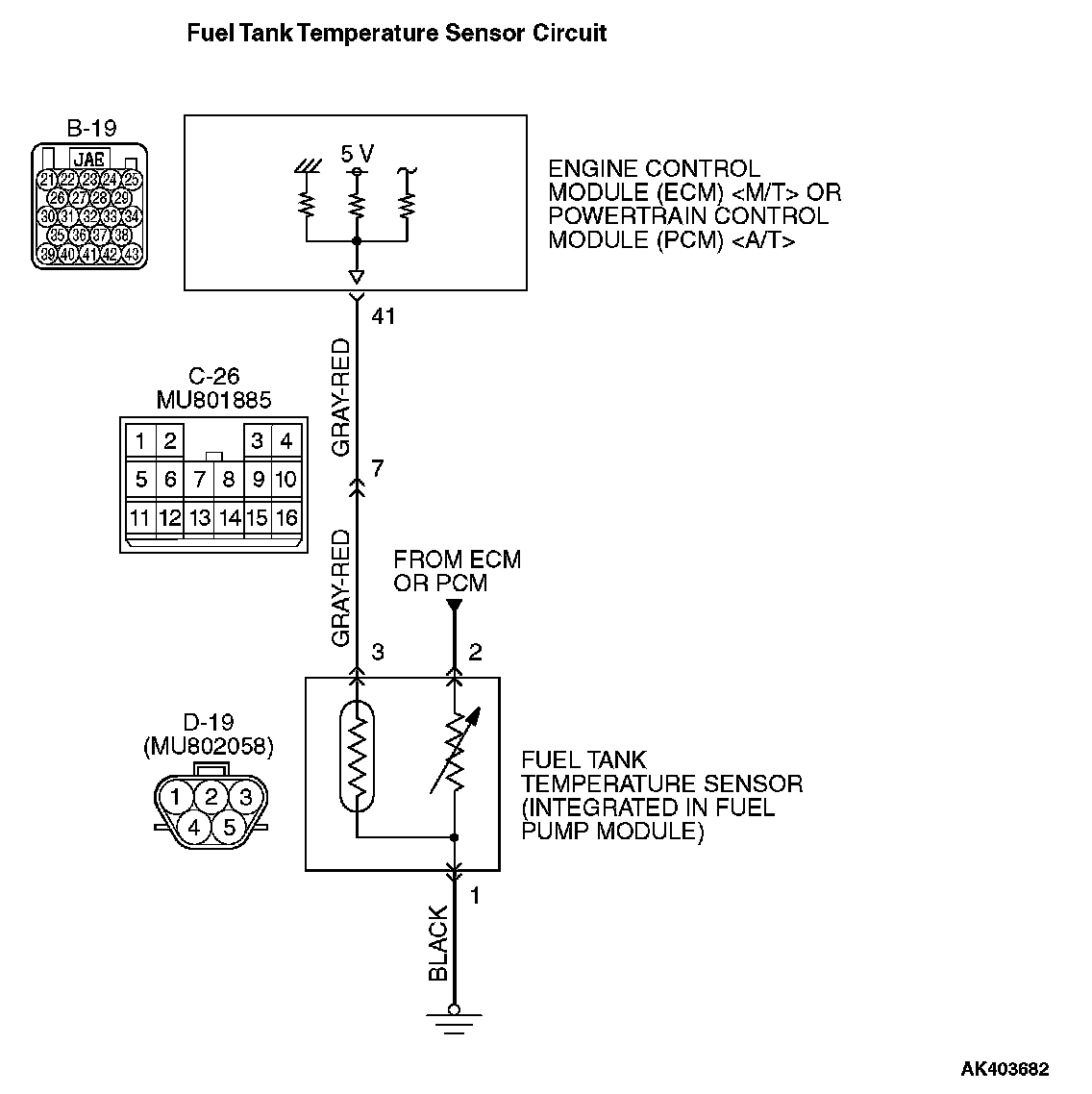 - 5-volt voltage is applied to the fuel tank temperature sensor output terminal (terminal No. 3) from the ECM