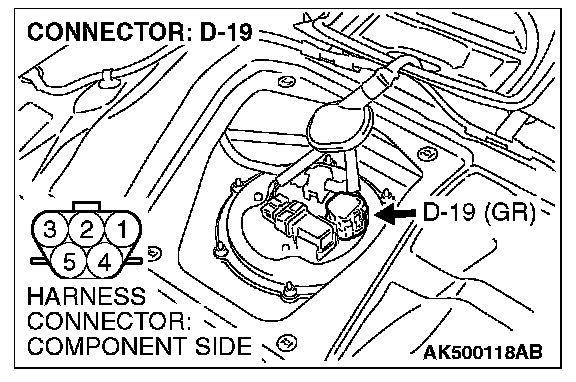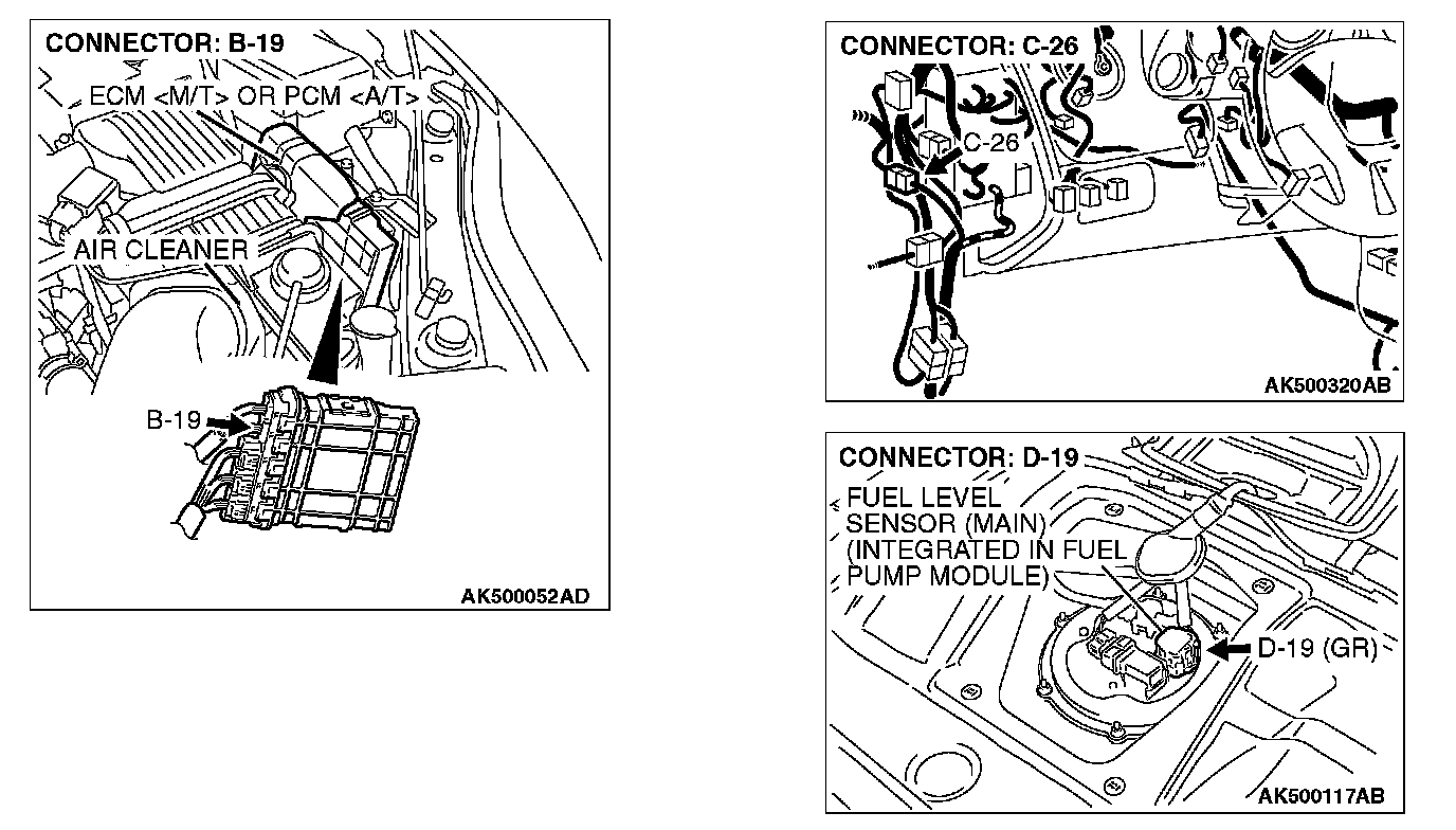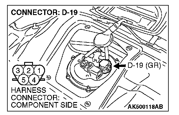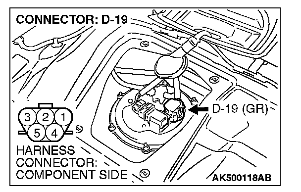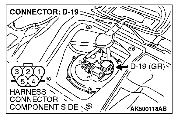 STEP 2. Check harness connector D-19 at the fuel tank temperature sensor for damage.