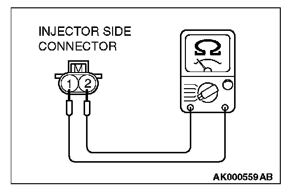 2. Measure the resistance between injector side connector terminal No. 1 and No. 2.