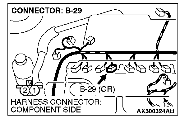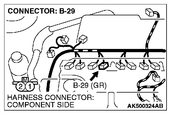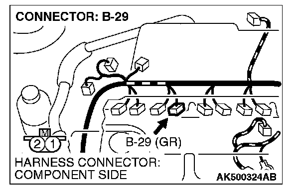1. Disconnect the No. 2 cylinder injector connector B-29 and connect the test harness special tool MB991658 between the separated connectors. (All terminals should be connected.)