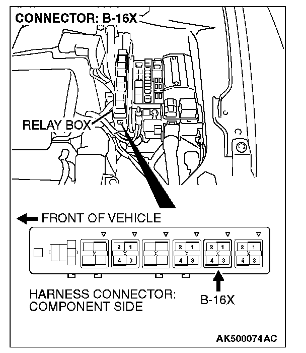 STEP 5. Check harness connector B-16X at MFI relay for damage.