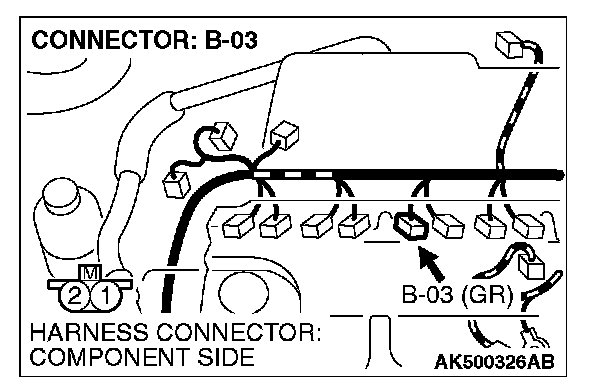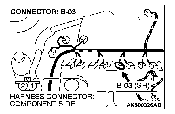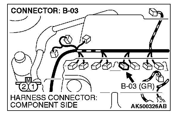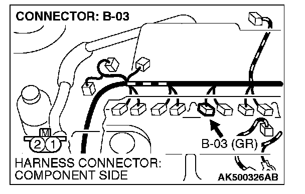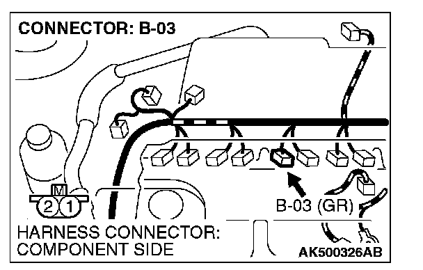 1. Disconnect the injector No. 3 connector B-03 and connect the test harness special tool MB991658 between the separated connectors. (All terminals should be connected.)